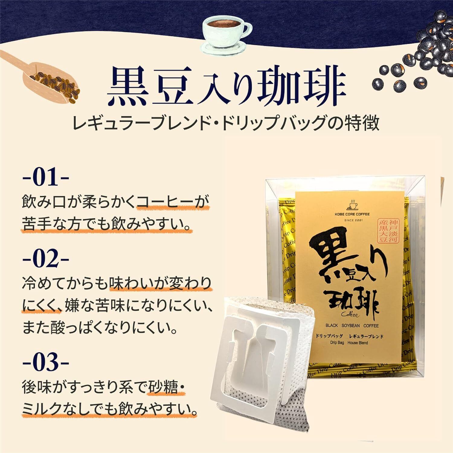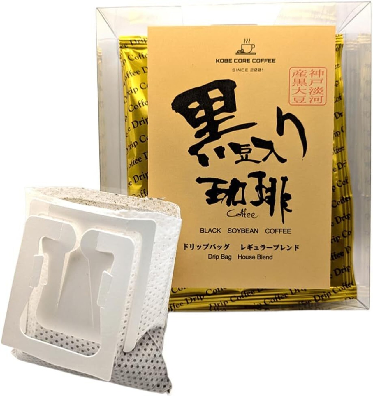 黒豆入り珈琲 レギュラーブレンド ドリップバッグセット ドリップコーヒー、ミルク砂糖なしでも飲みやすい、冷めても味が変わりにくい、1杯分づつお手軽に (7g×5(化粧箱入), レギュラーブレンド)