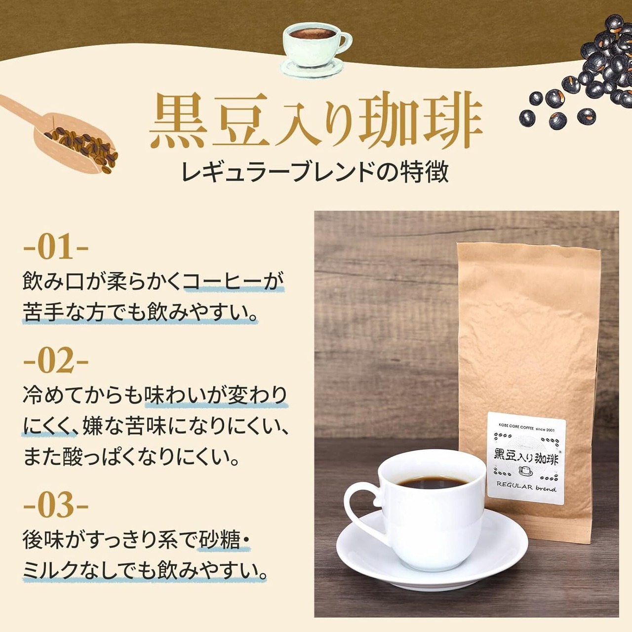 珈琲豆と黒豆の味わいが引き立ち、柔らかくスッキリとした後味。